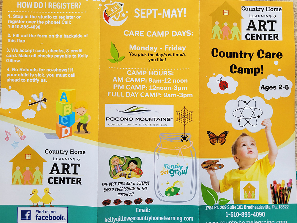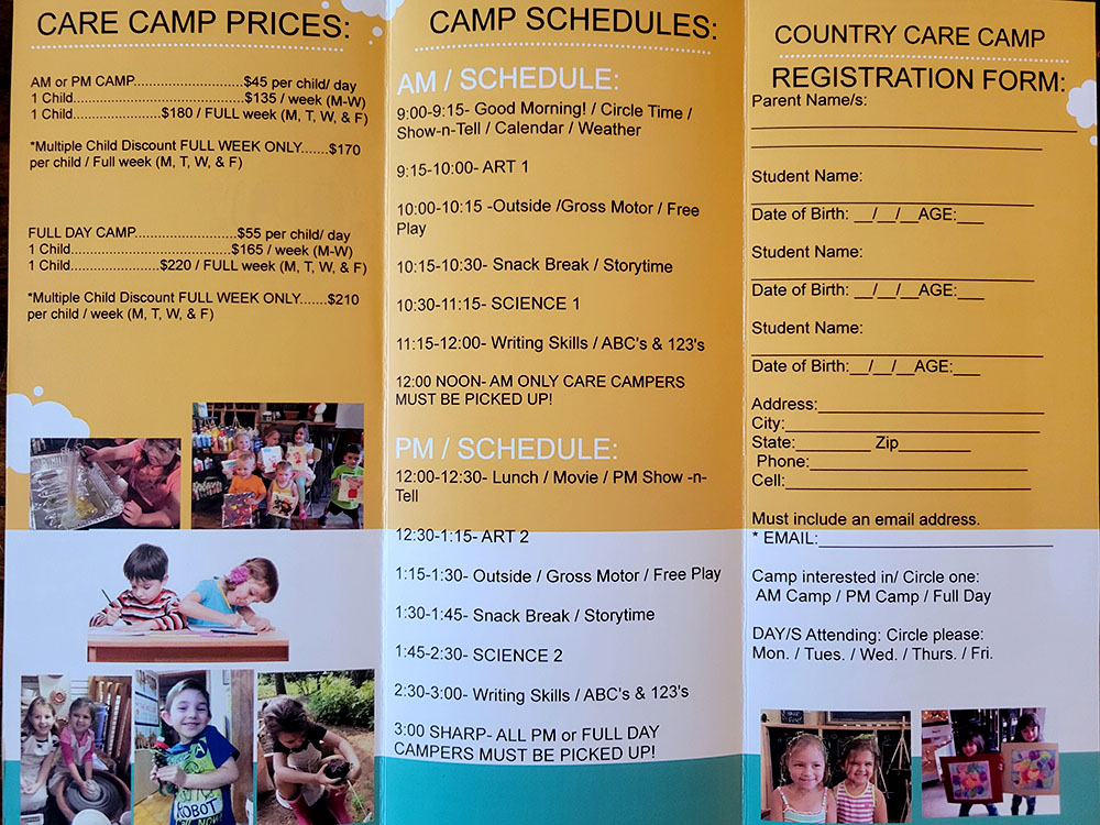 -"I began the Country Care Camp Program in the fall to introduce my 3 year old son to preschool activities and get him socializing with other children his own age. We initially started with the ½ day option once a week, but within a few weeks he began attending all 3 days, (sometimes ½ day and sometimes full day) because he enjoyed it so much. The flexibility of the program to be ½ day or full day is great and the pricing is very reasonable. I love the focus on Science and Art Centered Learning and my son loves going to "school" to do his projects every day. I can see at home how much he has progressed in such a short time. He loves singing his ABC's now, he can identify some letters and is practicing writing skills in his art work at home! I love how much he enjoys going to "school", playing with his friends, and showing off his projects."